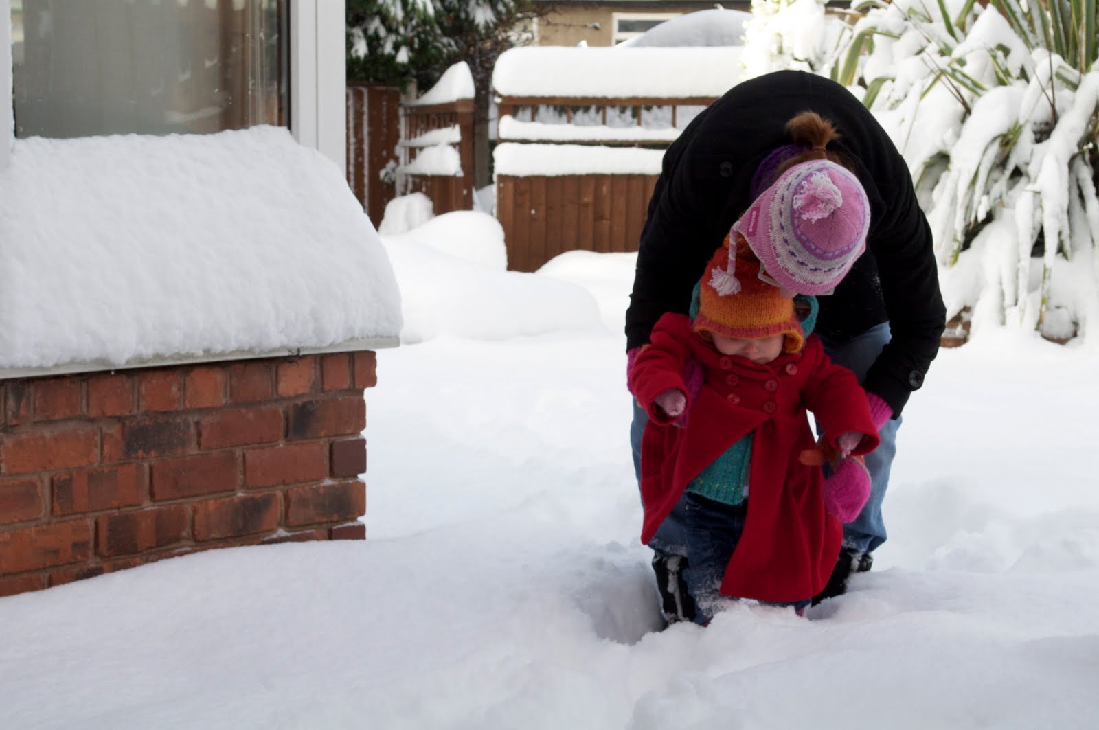 It's still snowing. I thought that it had stopped, but was sadly mistaken. Anyway, after breakfast, I thought that it would be fun to take Edith out for her first (real .. since last year could hardly count; she was way too young to even be aware) snow. It lasted less than 5 minutes. I put her wellies on .. which are a size too big, 2 sweaters, mittens, a scarf, her hat, and a wool coat (yes, she's a red coat) and out we went.